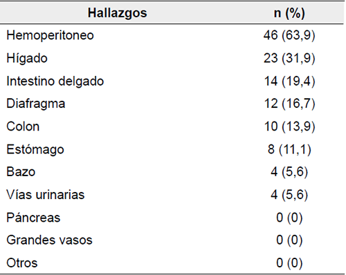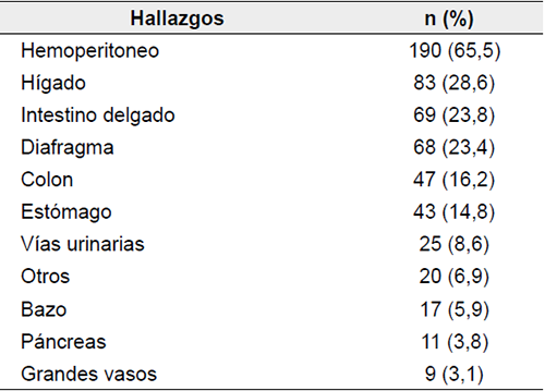 De este grupo de 290 pacientes operados, en 252/290 (86,8 %) la laparotomía fue terapéutica y en 38/290 (13,1 %) no fue terapéutica. El hígado (83/290, 28,6 %), el diafragma (23,4 %) y el intestino delgado (69/290, 23,8 %) fueron los órganos principalmente comprometidos. En 160/290 (65,5 %) de los pacientes se documentó hemoperitoneo (tabla 3).