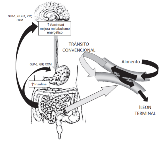Al modificar la cinética de las incretinas, la GLP-1 y la GLP-2 contribuyen a la pérdida ponderal mediante su actividad en el vaciamiento gástrico, así como en la activación del sistema de la proopiomelanocortina. La bipartición del tránsito intestinal puede favorecer una pérdida mayor de 10 % del peso inicial en 66,7 % de los pacientes.