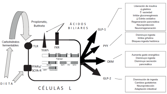 La dieta interactúa con el paciente y su microbiota, modificando su conformación y la producción de butiratos, propionatos, productos de fermentación de los carbohidratos (prebióticos) y ácidos grasos libres; estos interactúan por medio de los receptores TGR5, FFARs/SCFA-R, TLR y TR de las células L del intestino distal, para favorecer la producción de incretinas, como el péptido GLP-1 y el péptido YY, modificando el patrón alimentario, la saciedad, la secreción de insulina y la supervivencia o regeneración pancreáticas.