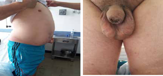 En el examen físico, se encontró un paciente de sexo masculino sin alteraciones neurológicas, con distensión abdominal, hepatomegalia, onda ascítica positiva, várices escrotales (figura 1) y edema de grado II, con fóvea, en los miembros inferiores.