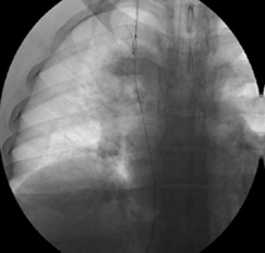 Bajo anestesia general, con monitorización con línea venosa y pulsioxímetro, se hicieron una punción en la vena femoral común derecha con un introductor 6 French y una punción yugular interna derecha con introductor 5 French (Cordis™ - Johnson & Johnson).