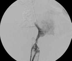 Se practicó una cavografía y se encontró trombosis de la vena cava inferior, desde la vena renal izquierda; la vena cava superior era normal (figura 3). Se procedió a cambiar el introductor femoral por un 8 French (Cordis™ - Johnson & Johnson) y se practicó una trombectomía venosa percutánea con el sistema de tromboaspiración de penumbra (Penumbra Medical Systems, Inc.), extrayendo moderada cantidad de coágulos subagudos.