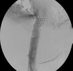 Se procedió a realizar angioplastias secuenciales con balones de 10, 12 y 14 mm de diámetro (Boston Sci. Corp.), logrando repermeabilizar la vena cava, pero con una estenosis residual del 60 % (figura 5). Se continuó colocando dos endoprótesis (stents) de Palmaz con balón montado de 24 mm de diámetro (Cordis™ - Johnson & Johnson). La vena cava se recanalizó de manera completa y las venas suprahepáticas eran permeables (figura 6).