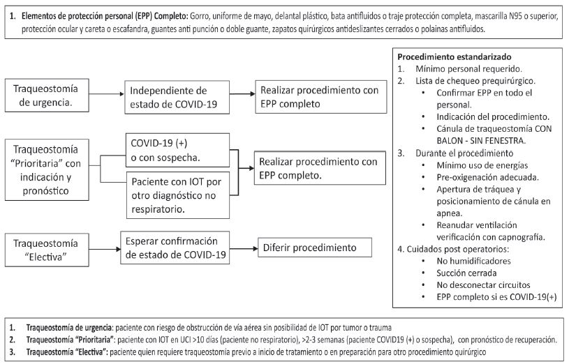 El curso clínico de la infección por COVID-19 en el paciente crítico todavía no ha sido caracterizado completamente. Por ende, se debe considerar el equilibrio entre el riesgo de infección por el virus debido a la propagación en aerosol y la decisión de realizar una traqueostomía. Por lo anterior es muy importante establecer los procedimientos verdaderamente urgentes para ser priorizados.