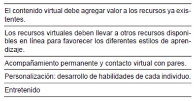 La pedagogía virtual difiere de la presencial en el hecho que depende del interés y disciplina del estudiante. Existen diferentes estrategias para permitir el desarrollo de estas habilidades, como la diversificación de herramientas para adquirir un mismo conocimiento. Esto se logra con podcasts, clases magistrales, videos explicativos, clases invertidas, lecturas, clubes de revista y foros de discusión, entre otros. Al contar con tal diversidad de herramientas, es posible cubrir los diferentes estilos de aprendizaje de los cirujanos. En la tabla 1 se mencionan los principios básicos de la educación quirúrgica virtual 9,10.