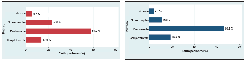 Llama la atención que la mayoría de encuestados (63%) perciben que estas recomendaciones se cumplen parcialmente, con una tendencia a considerar que existe una menor adherencia en los hospitales públicos que en los privados. Aunque el objetivo de esta encuesta no fue la medición directa de la adherencia a los protocolos de bioseguridad, varios factores han sido identificados por parte de los trabajadores de la salud, como barreras y facilitadores para cumplir con las recomendaciones de control y prevención de enfermedades infecciosas, entre ellos, el apoyo administrativo, la disponibilidad del espacio físico para aislamiento, el entrenamiento y el acceso a los elementos de protección personal 13.
