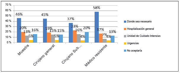 El 46 % (n=214) de los encuestados reportó ‘estar dispuesto’ a ser segunda línea de atención en el servicio hospitalario que sea necesario (figura 2). A pesar de que solo el 13.3 % (n=62) de los encuestados reportaron ‘estar dispuesto’ a apoyar en el servicio de cuidado intensivo, el 45 % (n=209) de los participantes se consideran en la capacidad de dar soporte ventilatorio mecánico. Adicionalmente, no se observaron diferencias significativas en las preferencias de los servicios, ni en la capacidad reportada para brindar soporte ventilatorio mecánico, según el nivel de entrenamiento quirúrgico (p=0.09 y 0.48, respectivamente).