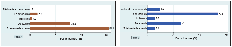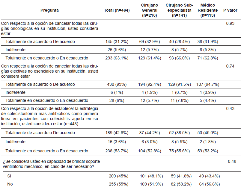 Con respecto a las adaptaciones de los servicios quirúrgicos ambulatorios, el 93 % (n=430) de los participantes estuvo ‘totalmente de acuerdo’ o ‘de acuerdo’ en la cancelación de cirugías electivas no esenciales. Sin embargo, con respecto a los procedimientos electivos en pacientes oncológicos, aunque el 53.6 % (n=249) consideró estar ‘en desacuerdo’ en cancelar cirugías oncológicas, una cuarta parte de los encuestados (25 %, n=119) reportó estar ‘de acuerdo’ con esta medida (figura 3). No se observaron diferencias al comparar estas variables según el nivel de entrenamiento ni el tipo de hospital (p>0.05).
