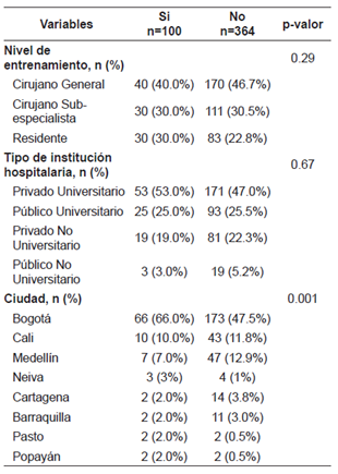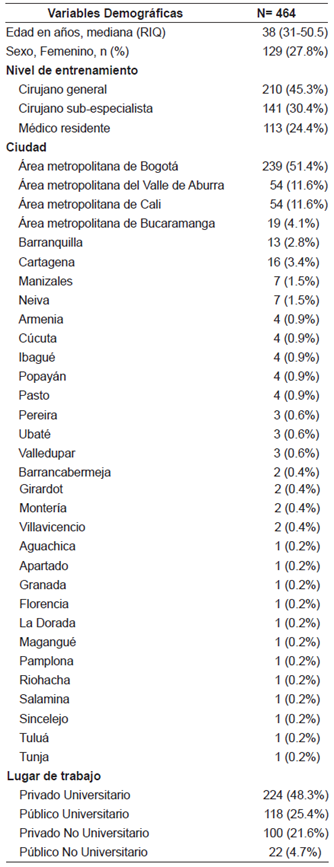 De los 477 encuestados, se excluyeron 13 participantes por no cumplir con los criterios de inclusión. Entre los 464 participantes restantes, la mediana de edad fue 38 años (RIQ 31, 50.5), 27.8 % (n=129) fueron mujeres, y 45.3 % (n=210) cirujanos generales. El hospital universitario privado (48.3 %, n=224) fue el tipo de institución hospitalaria de mayor representación en la muestra (tabla 1). Adicionalmente, la mayor parte de los participantes provinieron del area metropolitana de Bogotá (51.4 %, n=239), seguido por el area metropolitana del Valle de Aburra (11.6 %, n=54), y Area metropolitana de Cali (11.6 %, n=54).