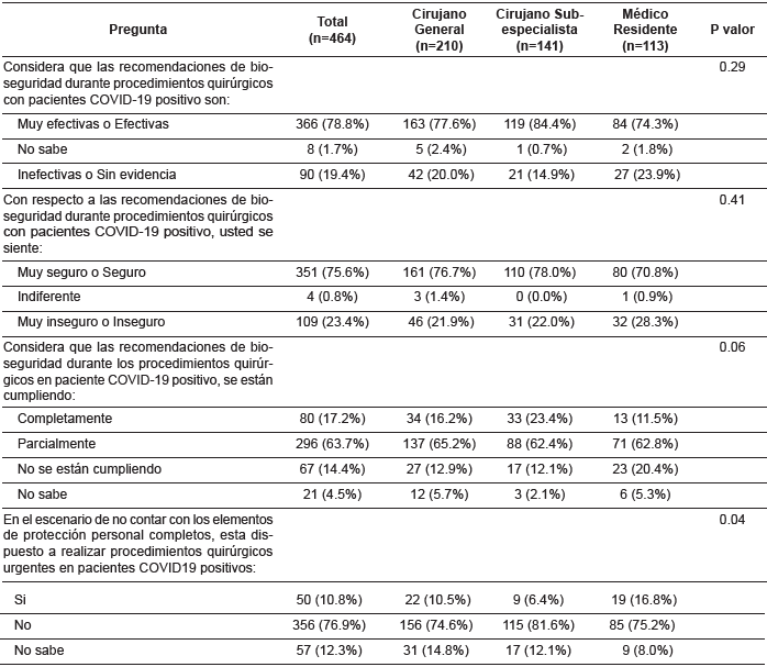 De acuerdo a las recomendaciones para procedimientos quirúrgicos en pacientes COVID-19 positivos, el 78 % (n=366) de los encuestados consideraron que las medidas de protección son ‘muy efectivas’ (n=121) o ‘efectivas’ (n=245). De igual manera, el 75.6 % (n=351) de los encuestados reportó sentirse ‘muy seguro’ o ‘seguro’ con estas recomendaciones para realizar procedimientos quirúrgicos. Al estratificar estas variables por nivel de entrenamiento, no hubo diferencia significativa (p>0.05) en la percepción de las recomendaciones de bioseguridad entre la comunidad quirúrgica (tabla 3).