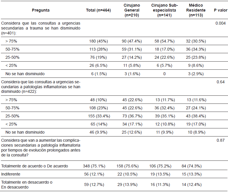 Con respecto al impacto de la pandemia sobre los patrones de consulta a los servicios de urgencias, se observó que el 73 % (n=293) de los participantes consideraron que las urgencias secundarias al trauma se han disminuido en más del 50 %. Cabe resaltar que menos del 2 % de los encuestados consideran que la pandemia no ha tenido ningún impacto en las consultas secundarias al trauma (tabla 4). En contraste, no se observó una distribución diferencial significativa en la percepción del impacto en las consultas secundarias a patologías inflamatorias, con 33 % (n=155) de los participantes reportando un descenso entre el 25-50 %. Sin embargo, la mayoría de los encuestados (75 %, n=348) esperan que aumenten las complicaciones en patologías inflamatorias, debido a tiempos de evolución prolongados al momento de la consulta. Al evaluar la percepción de los patrones de consulta secundarias a trauma y patología inflamatoria por tipo de hospital, no se observaron diferencias significativas entre hospitales públicos y privados (p=0.1 y 0.4, respectivamente).