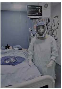 Realice una higiene de manos estándar y utilice una técnica de doble guante, que se ha recomendado para reducir el riesgo de transferencia viral durante la retirada de los EPP 27. Use ropa quirúrgica y una bata resistente a los fluidos, gorro quirúrgico, máscara N-95 o P100 o superior y protección ocular completa 28 (figura 3).