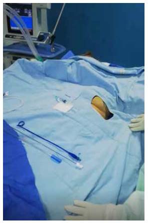 Cubra completamente el paciente y la cama después de la preparación estéril del tórax para evitar cualquier contaminación de la cama, la almohada, las sábanas o el equipo (figura 4).