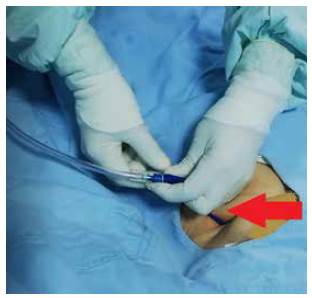 Deslice suavemente el catéter hacia la cavidad pleural, al mismo tiempo que retira la endocanula metálica y la jeringa. Antes de retirarla por completo, ocluya el catéter con una pinza de Kelly, sin comprometer su estructura, y después termine la extracción de la endocanula.