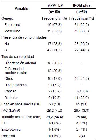 Se recolectó información de 109 procedimientos (59 TAPP/TEP y 50 IPOM plus) practicados durante el periodo 2015-2018 (tabla 1). En ambos grupos, la mayoría de las cirugías se realizó en mujeres (62 %) y la presencia de condiciones basales de riesgo fue de 44 %, especialmente debidas a hipertensión arterial y otras enfermedades cardiovasculares. Los procedimientos fueron realizados en población adulta, con edad promedio de 58 años, y según los valores de referencia del índice de masa corporal (IMC) dados por la Organización Mundial de la Salud (OMS), la mayoría de los pacientes se encontraba en estado de pre-obesidad (IMC= 25 a 29,9 kg/m2).