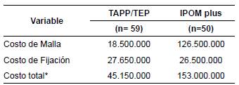 Results.: Information from 109 procedures was collected and analyzed; 59 of the extraperitoneal group TAPP / TEP and 50 of IPOM plus group, carried out during the years 2015 to 2018, by the abdominal wall group of Clinica Colsanitas, identifying a saving of 69,8 % or cost-benefit results in favor of the extraperitoneal group.
