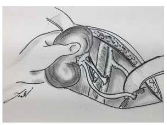 Es importante aclarar dentro de la técnica quirúrgica de trasplante renal la localización habitual del trasplante, el cual es heterotópico, y se realiza inicialmente en la fosa iliaca derecha, debido a que los vasos iliacos en esa localización son más superficiales, lo que facilita la reconstrucción vascular. Igualmente se recomienda la ubicación del riñón (derecho o izquierdo), en la fosa iliaca contralateral, para tener una exposición anterior de la pelvis renal y el uréter, facilitando la reconstrucción del tracto urológico (Figura 2).