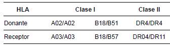 En noviembre de 2018 se realiza trasplante renal con donante cadavérico, considerado de bajo riesgo inmunológico, por panel reactivo de anticuerpos de 0 %, con compatibilidades aceptables para moléculas de Clase I y Clase II, y mismatch de 4/1 (tabla 1), y de riesgo intermedio para infección por citomegalovirus. Se registró isquemia fría de 11:10 minutos e isquemia caliente de 40 minutos.