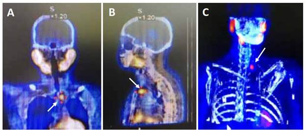 La gammagrafía realizada con Tc99m(tecnecio)-Sestamibi, tanto en imágenes planares como de tomografía computarizada por emisión de fotón único (SPECT, por sus siglas en ingles), tiene utilidad en la localización de adenomas paratiroideos, especialmente en aquellos de tamaño superior a 500 mg 18,19. La sensibilidad y la especificidad mejora cuando las imágenes de SPECT son fusionadas con imágenes de la tomografía computarizada (figura 1), preferiblemente adquiridas en equipos híbridos, pasando la sensibilidad de 83 % a 96 % y la especificidad de 80 a 93 %, ventajas más evidentes en adenomas de menor tamaño, de alrededor de 210 mg 20. La sensibilidad es menor (58 %) en el caso de glándulas hiperplásicas 21. Cuando las imágenes de medicina nuclear convencional (SPECT) son negativas, una alternativa es realizar una tomografía por emisión de positrones (en inglés, PET-CT) con C11-Metionina, con F18-Colina o C11-Colina 22,23.