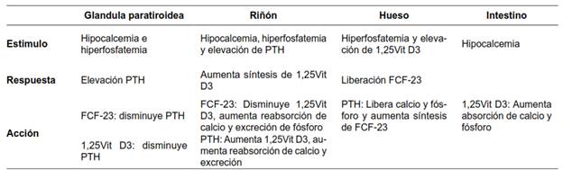 A nivel del túbulo proximal renal, normalmente se realiza un intercambio recíproco entre el calcio y el fósforo para mantener sus niveles estables. Así mismo la 1α-hidroxilasa permite la activación de la vitamina D (calcitriol). La acción de la 1α-hidroxilasa es suprimida por el FCF-23. La hipocalcemia e hiperfosfatemia estimulan la producción de PTH, mientras la vitamina D la inhibe 6,7,8(tabla 1).