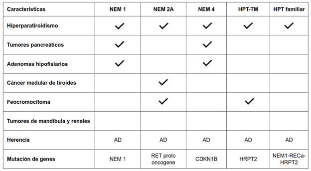 El síndrome de neoplasia endocrina múltiple (NEM) tipo 1, es causado por mutaciones inactivadoras en el gen NEM1 (11q13) que codifica la proteína menina, un supresor tumoral. Inicialmente descrito en 1954, es la causa más común de HPTP familiar, representando aproximadamente 2-4 % de todos los casos 13. Se caracteriza por una predisposición a desarrollar tumores endocrinos a nivel de la hipófisis, paratiroides y tumores neuroendocrinos pancreáticos y del tracto gastrointestinal. La asociación de la mutación del gen NEM1 con la presentación esporádica o familiar de adenomas paratiroideos ha sido bien documentada, mientras que su asociación con el carcinoma paratiroideo es rara. El HPTP es el trastorno endocrino más frecuente, presente en alrededor del 90 % de los pacientes entre 20 y 25 años y generalmente hay compromiso multiglandular con crecimiento de todas las glándulas.