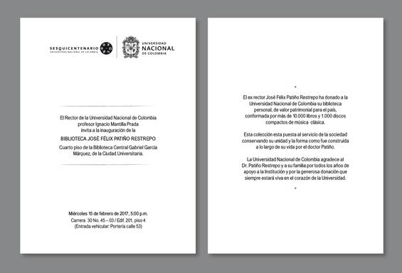 La Universidad Nacional de Colombia creo hace poco la Cátedra Patiño Restrepo, como reconocimiento a la inmensa labor y a la obra académica y científica del doctor José Félix Patiño. El 15 de febrero de 2017 asistimos por invitación del rector de la Universidad Nacional, doctor Ignacio Mantilla, a la inauguración del ala de la biblioteca de la Universidad Nacional que lleva su nombre y donde fueron instalados los más de once mil volúmenes donados por el doctor José Félix a esa Universidad, entre los cuales se pueden encontrar “La historia natural de Plinio”, así, como sus obras sobre música, especialmente operática, junto con los varios textos que escribió sobre Maria Callas, de la cual, el doctor Patiño era una verdadera autoridad con reconocimiento mundial.