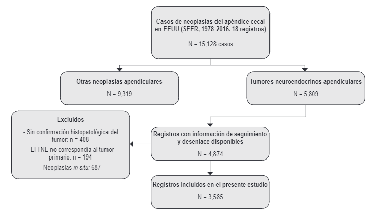 A partir de los resultados obtenidos se incluyeron solo aquellos registros con una confirmación histopatológica de la neoplasia, un seguimiento completo y la disponibilidad de la causa de muerte en el registro. Finalmente, fueron excluidos aquellos pacientes en los que el tumor neuroendocrino del apéndice cecal no representaba el tumor primario, aquellos en los que no existían datos sobre las características del tumor (tamaño, grado histológico o extensión) y aquellos que no fueron llevados a cirugía.