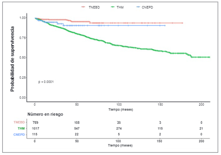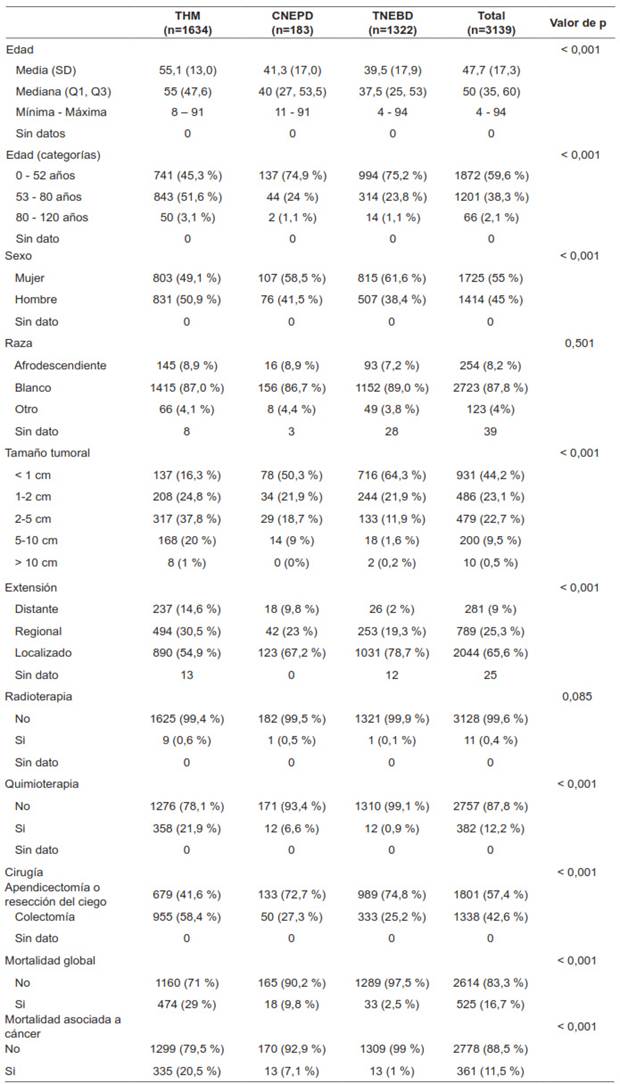 Los tumores de histología mixta se presentaron en pacientes significativamente mayores y más frecuentemente en hombres, comparado con los otros subtipos histológicos de tumores neuroendocrinos. Adicionalmente, los THM tendieron a ser de mayor tamaño y a afectar con mayor frecuencia estructuras regionales y distantes, siendo llevados más frecuentemente a procedimientos quirúrgicos de tipo colectomía y exhibiendo un mayor riesgo de mortalidad en comparación de sus contrapartes TNEBD y CNEPD (tabla 2 y figura 2).