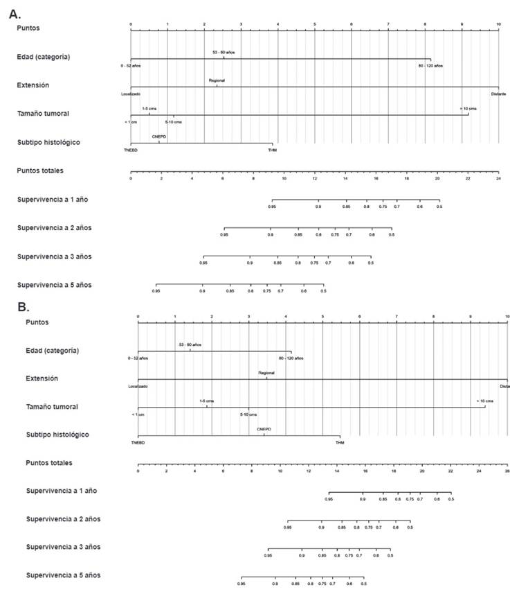 Resultados.: Se incluyeron 3585 pacientes con diagnóstico de TNE-A, el 55,8 % fueron mujeres, y la mediana de edad fue de 49 años. El subtipo histológico más frecuente fue el Tumor de Histología Mixta (THM). La edad, el subtipo histológico, el tamaño y la extensión tumoral, fueron las únicas variables asociadas independientemente con la supervivencia después del análisis multivariado. El nomograma validado presentó una capacidad de discriminación sobresaliente para predecir tanto supervivencia general 0,81 (IC95%: 0,76-0,86), como específica a cáncer 0,88 (IC95%: 0,83 a 0,92).
