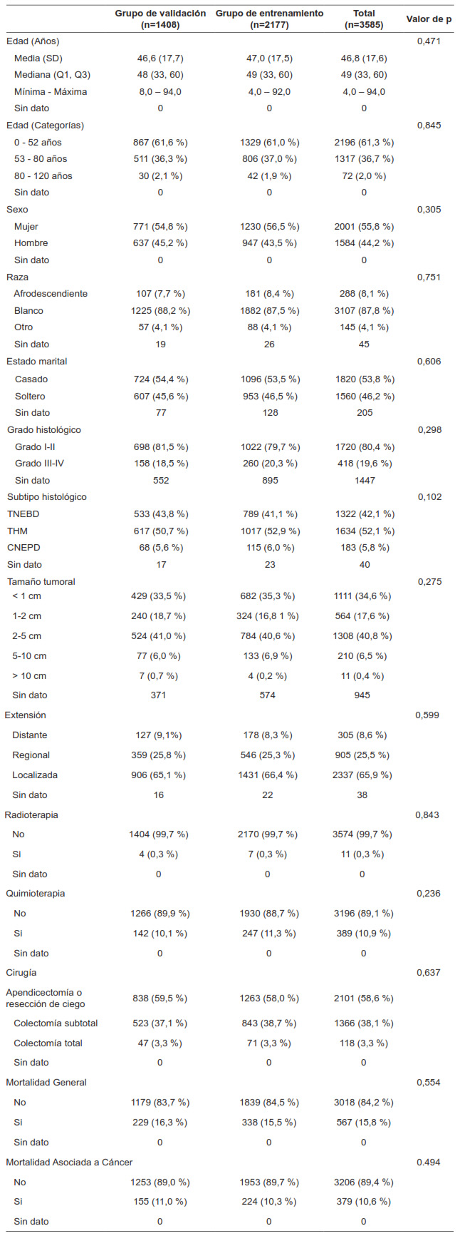 Del total de 3585 individuos, fueron asignados 2177 pacientes en la cohorte de entrenamiento del modelo y 1408 pacientes en el grupo de validación. El grupo de entrenamiento se utilizó para la validación interna del modelo, mientras que el grupo de validación fue utilizado para la validación externa del mismo. En la cohorte de entrenamiento se reportaron 338 (15,5 %) fallecidos por cualquier causa, de los cuales 224 (10,3 %) tuvieron una causa relacionada a la neoplasia apendicular. Por otra parte, en la cohorte de validación fallecieron 229 (16,3 %) pacientes, de los cuales 155 (11,0 %) murieron por complicaciones asociadas a la neoplasia de estudio. Las características principales de las dos cohortes de estudio se encuentran resumidas en la tabla 1. Cabe destacar que no se presentaron diferencias significativas en ninguna variable evaluada entre los dos grupos de estudio.