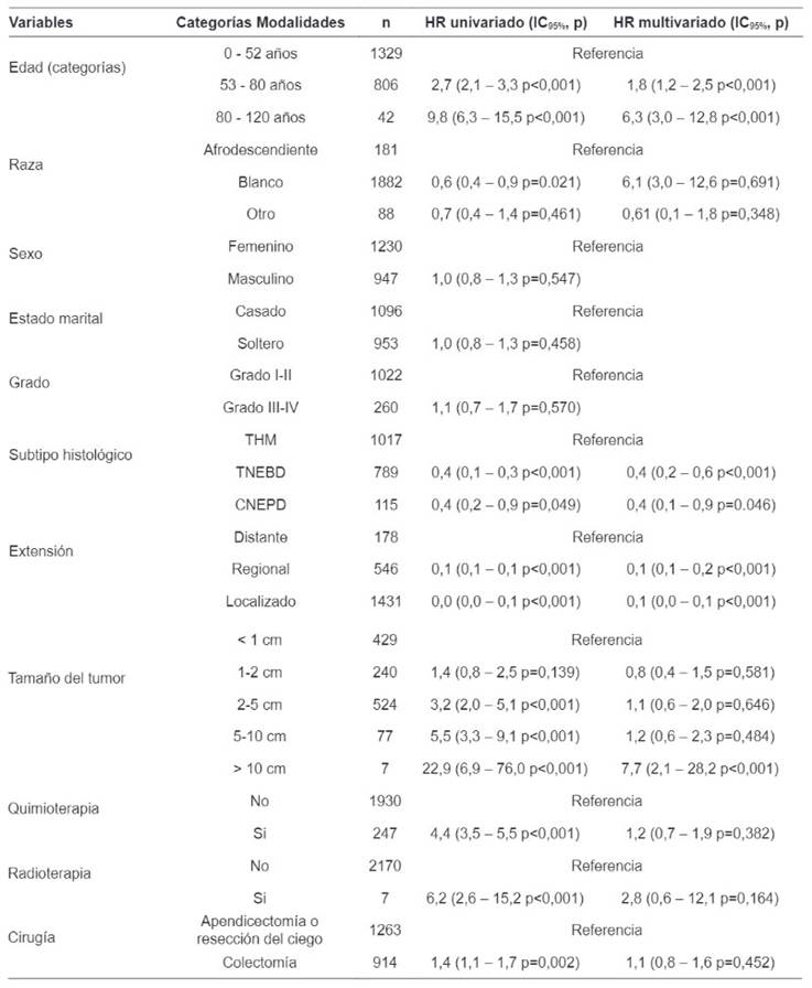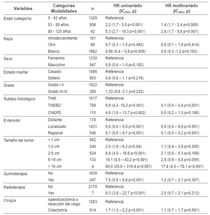 Múltiples variables se asociaron significativamente con el desenlace de sobrevida global en el análisis bivariado como se puede observar en la tabla 2, sin embargo, solo la edad, la extensión, el subtipo histológico y el tamaño tumoral, fueron predictores independientes en el análisis multivariado. Se evidenció un mayor riesgo de mortalidad por cualquier causa a medida que se incrementaba la edad, la extensión y el tamaño tumoral. Por otra parte, el subtipo histológico mixto, se asoció con un riesgo significativamente mayor de mortalidad por cualquier causa, luego del ajuste multivariado (tabla 2).