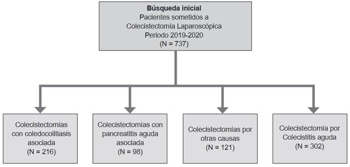 La búsqueda de los pacientes se realizó en la base de datos del servicio de quirófanos del Hospital Universitario de Santander, utilizando el filtro “colecistectomía laparoscópica” en el ítem de procedimiento en las bases de los años “2019” y “2020”. Los pacientes fueron clasificados en dos grupos usando como punto de corte el 6 de marzo de 2020, fecha en la que se registró el primer caso por COVID-19 en Colombia 20.