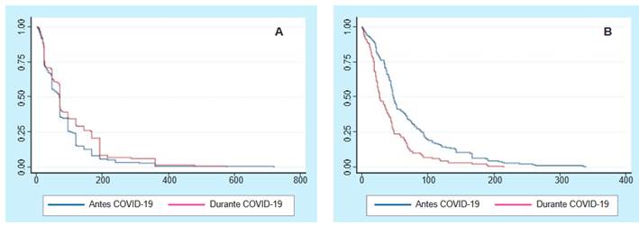 Los resultados obtenidos en este estudio muestran una distribución demográfica igual en cuanto a sexo y edad de presentación, en los dos períodos establecidos, siendo similar a lo descrito en otros estudios 24. El tiempo de evolución de los síntomas de los pacientes hasta su ingreso al hospital fue menor en el período previo a la pandemia, resultados explicados probablemente por el confinamiento, el limitado acceso a medios de transporte y el miedo al contagio, que fue mayor en el primer semestre del 2020.