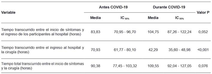 El tiempo transcurrido entre el inicio de síntomas y el ingreso de los pacientes al hospital antes del COVID-19 fue menor con una media de 83,3 horas (IC95%: 70,95 - 96,70) comparado con una media de 104,75 horas (IC95%: 87,26 - 122,24) durante la pandemia (Tabla 1). En contraste, el tiempo transcurrido entre el ingreso al hospital y el procedimiento quirúrgico fue mayor en los participantes ingresados al hospital previo a la actual pandemia por COVID-19, siendo esta diferencia estadísticamente significativa. Sin embargo, el tiempo total transcurrido entre el inicio de los síntomas y la cirugía fue mayor en los pacientes atendidos durante la pandemia, pero sin diferencia estadísticamente significativa al compararlos con los pacientes manejado antes de la pandemia (Figura 2).