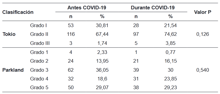 Según la clasificación de Tokio, los pacientes se presentaban con mayor frecuencia en el grado I de severidad y en menos proporción en los grados II y III previo al inicio de la pandemia, sin diferencia estadísticamente significativa comparado con el periodo de pandemia. La severidad intraoperatoria medida por la clasificación de Parkland mostró una distribución similar en los dos grupos (Tabla 2).
