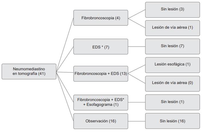 El manejo y diagnóstico de los pacientes con neumomediastino se muestra en la Figura 1. Cuatro (9,7 %) pacientes fueron sometidos a fibrobroncoscopia, siete (17 %) a EDS, trece (31,7 %) a fibrobroncoscopia más EDS y solo un (2,4 %) paciente fue sometido a fibrobroncoscopia más EDS y esofagograma debido a la sospecha persistente de lesión esofágica a pesar de una EDS sin hallazgos relevantes. Dieciséis (39 %) pacientes fueron observados sin estudios diagnósticos, y no presentaron signos de lesiones aerodigestivas subyacentes. La estancia hospitalaria promedio fue de 16,8 días.