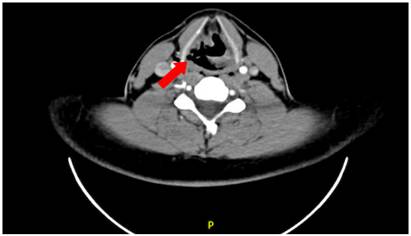 La sensibilidad, especificidad, valor predictivo positivo (VPP) y valor predictivo negativo (VPN) para el diagnóstico de lesiones aerodigestivas por TC se presentan en la Tabla 2. En un paciente se observó lesión de vía aérea en TC, confirmada mediante fibrobroncoscopia, la cual consistía en una lesión laríngea a nivel del hioides (Figura 2), como consecuencia de una colisión en motocicleta con trauma cervical directo, que fue manejada de manera conservadora. En otro paciente se identificó en TC una lesión esofágica, confirmada mediante EDS, consistente en dos desgarros lineales a nivel del esófago torácico, que requerían manejo quirúrgico; en este mismo paciente se evidenció una lesión de la tráquea durante la cirugía de reparación esofágica, no visualizada en TC ni en la fibrobroncoscopia, aun luego de revisar las imágenes de forma retrospectiva, por lo que se sospechó una lesión traqueal externa sin pérdida de la solución de continuidad. Ambas lesiones fueron consecuencia de una colisión de alta energía en motocicleta, para un total de tres lesiones aerodigestivas en dos pacientes. En ningún otro paciente se evidenció lesión de vía aérea que no hubiese sido visualizada o sospechada en TC. No se encontró lesión esofágica en el esofagograma contrastado por TC.