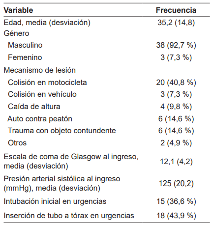 Se identificaron 6118 pacientes de la base de datos de trauma del hospital, quienes habían presentado trauma contuso entre enero de 2016 y diciembre de 2019. De esta cohorte se identificaron 41 (0,7 %) pacientes quienes cumplían con los criterios de inclusión.