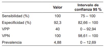 Se hizo análisis descriptivo de los registros clínicos y se clasificaron las variables en cualitativas y cuantitativas, las cuales se expresaron en frecuencia absoluta (n) y porcentajes (%), y medidas de tendencia central y desviación estándar, respectivamente. Se determinó la sensibilidad, especificidad, valor predictivo positivo y negativo de la TC, con un intervalo de confianza del 95 %.