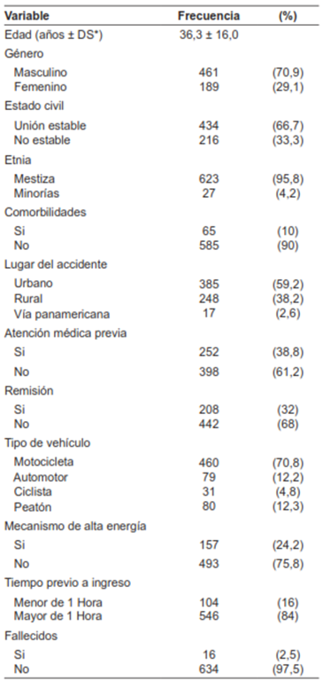 El análisis final se realizó con 650 pacientes. El 2,5 % (n=16) de los pacientes fallecieron, de estos el 93,2 % fueron hombres; el 75 % circulaba en motocicleta, 18,7 % en automóvil y 6,2 % como peatones.