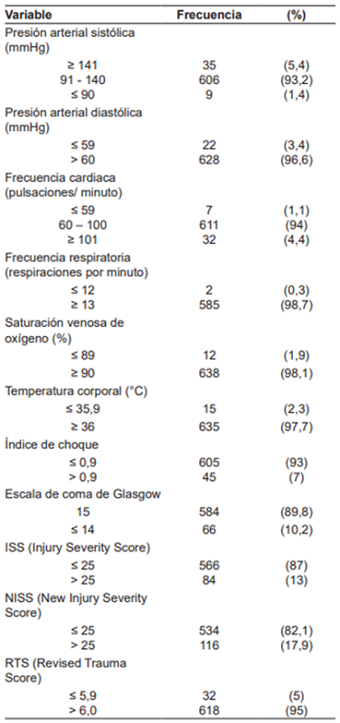 En lo concerniente a las variables fisiológicas (Tabla 2), encontramos que el 93,2 % de los pacientes ingresaron con presión arterial sistólica (PAS) normal, mientras en el 5,5 % de los pacientes se presentó una frecuencia cardiaca alterada y el 1,9 % de los pacientes baja saturación de oxígeno en sangre periférica. Solo el 2,3 % ingresó con algún grado de hipotermia y, con respecto al índice de choque, el 7 % fue mayor a 0,9. La escala de Glasgow fue menor a 14 en el 10,2 %. En cuanto a los puntajes de severidad de las escalas evaluadas, la ISS tuvo puntaje mayor a 25 en el 13 %, la NISS presentó puntaje mayor a 25 en el 17,9 % y la RTS tuvo puntaje menor de 6 en el 5 %.