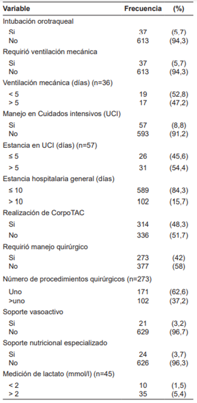En referencia a los procedimientos y pruebas diagnósticas realizadas en la población evaluada (tabla 3), el 5,7 % requirió intubación orotraqueal y ventilación mecánica, y de estos, el 47,2 % la requirió por más de 5 días. El 54,4 % de la población necesitó estancia mayor a 5 días en la unidad de cuidados intensivos (UCI). De los que no requirieron UCI, el 15,7 % permaneció hospitalizado en sala general por más de 10 días. Se realizó CorpoTAC al 48,3 % de los pacientes. El manejo quirúrgico fue necesario en el 42 % de la población; el 62,6 % necesitó una sola intervención y el 37,2 % más de un procedimiento. Por otro lado, el 3,2 % requirió soporte vasoactivo y el 3,7 % soporte nutricional.