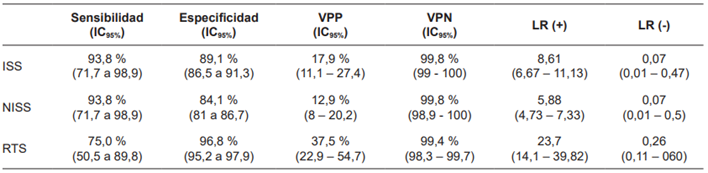 En resumen, se observó un buen rendimiento en las diferentes escalas de trauma evaluadas para predecir mortalidad. Mohammadzadeh y colaboradores 32 encontraron que la escala RTS tiene una sensibilidad del 99 %, especificidad 62 %, LR+ de 2,6 y LR - 0,02. Por el contrario, la escala ISS mostró una sensibilidad de 84 %, especificidad de 62 %, LR+ de 2,04 y LR - 0,24, resultados que son diferentes a este estudio, lo que podría ser explicado por el tipo de población en el cual se aplicó dicho estudio, en donde reportaron un promedio de edad 71,5 años, lo cual hace suponer presencia de más comorbilidades. En comparación, en el estudio de Patil y colaboradores 17, la RTS alcanzó 97,1 % de sensibilidad y 80,1 % de especificidad, la ISS, 91,2 % de sensibilidad y 89,9 % de especificidad, y la NISS, 91,2 % de sensibilidad y 93,4 % de especificidad. Por su parte, Reyhan y colaboradores 38 refirieron que todas las escalas tenían igual capacidad de predecir mortalidad, correlacionándose con los resultados de este estudio.