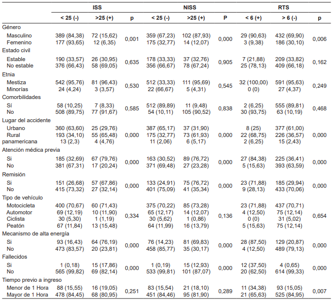 Al evaluar el rendimiento de las escalas de trauma (tabla 4) se encontró que la sensibilidad y la especificidad fueron adecuadas. El LR (+) fue de 23,7 para la RTS y 5,88 para la NISS. El LR (-) fue adecuado para ISS y NISS y pobre para RTS. Comparando las características basales según el resultado de las diferentes escalas (positiva o negativa) se evidenció que hay significancias estadísticas respecto a las variables de género, lugar donde ocurre el accidente, atención médica hospitalaria previa, mecanismo de alta energía y mortalidad. No se encontraron diferencias estadísticas en las demás variables (tabla 5).