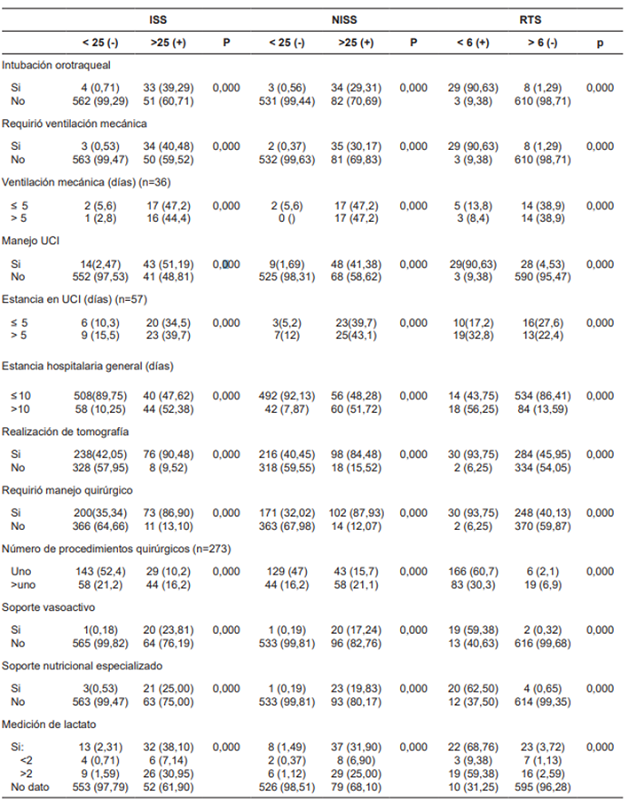 Con el análisis de las diferentes intervenciones o procedimientos practicados respecto al resultado de las escalas ISS, NISS y RTS, se evidenció que en todos hay diferencia estadísticamente significativa, lo cual se correlaciona con el adecuado rendimiento de las escalas de trauma evaluadas (tabla 6).
