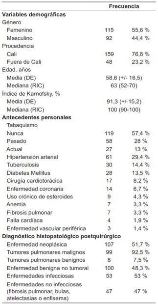 Resultados: Se evaluaron los registros clínicos de 207 individuos. El 55,5 % eran mujeres, la edad promedio fue 58 años y el 41 % tuvieron antecedente de tabaquismo. En el 51,6 % de los casos se diagnosticaron neoplasias, de las cuales el 47,8 % eran primarias de pulmón, siendo el adenocarcinoma el subtipo más común. Las enfermedades benignas no tumorales representaron el 48,3 % de los casos y la causa más frecuente fueron las infecciones, dentro de las que se incluyeron 17 casos de tuberculosis pulmonar. La técnica más frecuente fue la cirugía toracoscópica video asistida (82,6 %). Presentaron un porcentaje de reintervención del 5,8 %, 10,6 % de complicaciones severas y una mortalidad hospitalaria del 4,3 %.