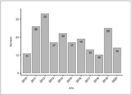Se evaluaron los registros clínicos de 207 pacientes sometidos a lobectomía pulmonar entre los años 2010 y 2020 (Tabla 1). La mayoría eran mujeres (55,6 %), con un rango de edad de 16 a 82 años y una media de 58 años. El año 2012 fue en el que se realizaron más procedimientos (15,9 %) (Figura 1).