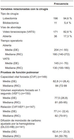 El sitio anatómico más frecuente de resección fue el lóbulo superior derecho en (28,5 %, n=59) y el menos frecuente el lóbulo medio derecho (11,6 %, n=24). El 5,3 % fueron resecciones bilobares (n=11). La técnica quirúrgica más utilizada fue la lobectomía pulmonar video asistida (82,6 %, n=171). El promedio del tiempo operatorio en esta técnica fue de 145 minutos (DE: 70,6), que fue menor que en la cirugía abierta (promedio de 204 minutos, DE: 93,4).