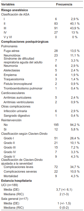 Las complicaciones postoperatorias se subdividieron en tres grupos: pulmonares, cardiovasculares y otras (incluyendo todo lo extratorácico). La más frecuente a nivel pulmonar fue la fuga de aire (13,5 %, n=28), mientras a nivel cardiovascular la más común fue la presencia de arritmias auriculares (2,4 %, n=5). En general, sólo 12 pacientes necesitaron reintervención quirúrgica (5,8 %).