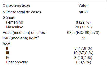 Durante el periodo de estudio, fueron tratados 28 pacientes, el 71 % hombres. La principal indicación fue cáncer de recto distal y medio. La mediana de edad fue de 68,5 años con un rango intercuartílico entre 60,5 y 73. El índice de masa corporal (IMC) promedio fue de 23 kg/m2, con tres pacientes en rango de obesidad (Tabla 1).